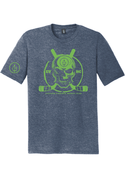 This one’s for the relentless. The bold. The ones who leave it all on the ice. Featuring a neon green skull-and-crossed-sticks graphic with the EVHC trident front and center, this tee is a statement piece for those who play hard and rep harder.